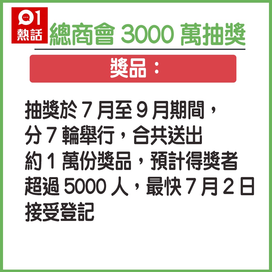 總商會將於7月至9月期間舉行幸運大抽獎每兩星期一次只要年滿18歲或以上持有有效香港身分證的香港居民以及在報名參加抽獎時已於香港接種兩劑疫苗即符合資格參加抽獎參加者須於抽獎活動專頁登記報名 總商會將送出總值約2000萬元獎品包括500張港鐵全年車票國泰商務機票酒店度假遊主題公園套票昂坪360來回纜車門票一系列總值.